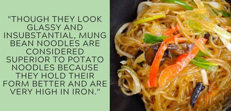 Mung bean noodles are created from only two ingredients; mung bean starch and water. Though they look glassy and insubstantial, mung bean noodles are considered superior to potato noodles because they hold their form better and are very high in iron.
