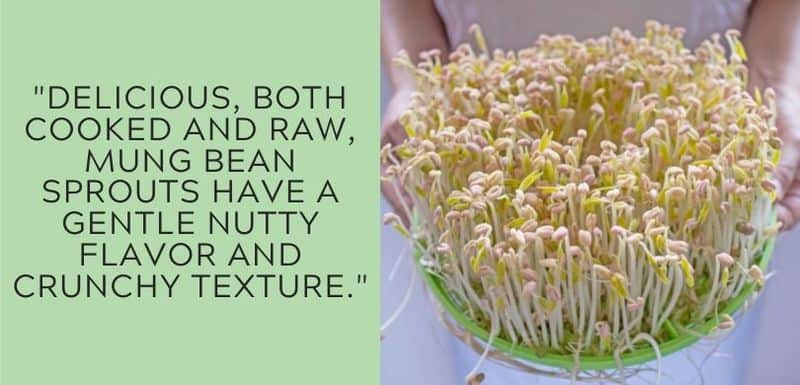 Mung bean sprouts are tender baby bean plants (7-10 days old). They have silvery white stalks with two tiny yellow leaves at the top. Delicious, both cooked and raw, mung bean sprouts have a gentle nutty flavor and crunchy texture.