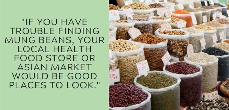 Mung beans are growing in popularity, and many grocery stores now carry them. If you have trouble finding mung beans, your local health food store or Asian market would be good places to look.